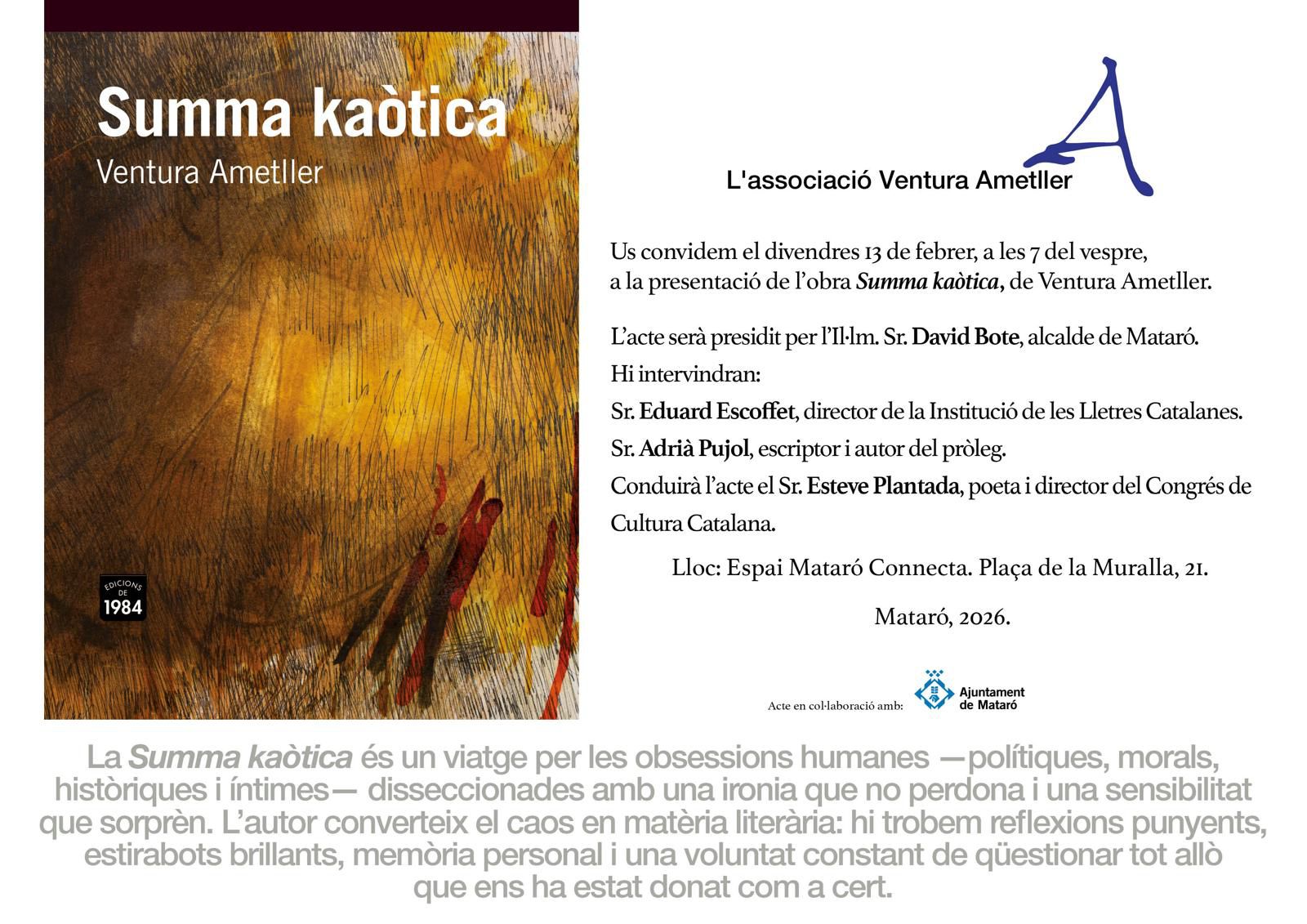 L’associació Ventura Ametller, que promou accions orientades a difondre l’obra de l’escriptor i a fomentar la creació literària en llengua catalana, convoca el setè premi de poesia Ventura Ametller.